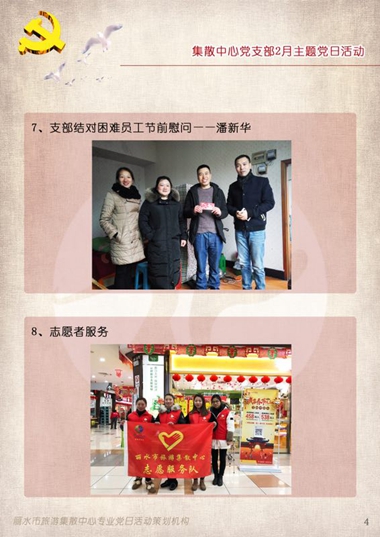 會后,葉學(xué)敏書記還代表集散中心黨支部慰問了結(jié)對幫扶對象潘新華,詳細(xì)的詢問了潘新華的工作、生活和身體情況,并為他們送上慰問金和新春祝福。黨員代表還組織參加了萬地廣場節(jié)前旅游安全、文明旅游宣傳的志愿服務(wù)。