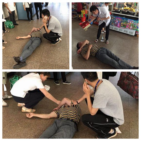 5月22日11時10分,東站的東大門進口通道上,一名中年男子突然倒地,全身不停地抽搐,翻著白眼,嘴里不時往外冒出嘔吐物。這一幕恰巧被正在巡查場地的辦公室主任陳樂觀看到。陳樂觀趕緊上前查看,并急忙撥打120、110。聞訊趕來的業(yè)務(wù)站副站長封慧麗和潘何豐也加入了幫忙的隊伍。