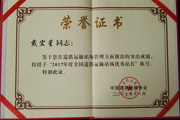 在中國道路運輸協會、中國海員建設工會全國委員會舉辦的 “2017年度全國道路運輸安全行車百萬公里駕駛員勞動競賽活動”中,長運分公司陳麗義獲全國優秀駕駛員;客運東站戴宏星獲全國優秀站場長。