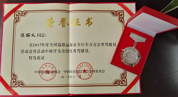 2017年11月,在中國道路運輸協會、中國海員建設工會全國委員會舉辦的 “2017年度全國道路運輸安全行車百萬公里駕駛員勞動競賽活動”中,陳麗義獲全國優秀駕駛員。面對榮譽他憨笑著說:“我只是做好自己的本責工作而已。”