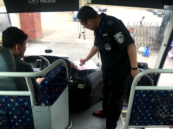 車輛出口門檢崗位上,保衛稽查科員認真核對人數、提醒乘客系好安全帶,把好“五不出站”關口。