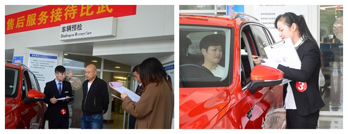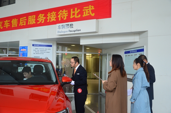 在下午進(jìn)行的售后接待比武項(xiàng)目中,主要設(shè)置了禮迎客戶、環(huán)車檢查、唱檢車檢項(xiàng)目、車輛問診、簽訂委托書等環(huán)節(jié),考察選手對維修接待崗位工作技能的熟悉程度和解決實(shí)際問題的能力。選取服務(wù)接待的典型工作任務(wù)--常規(guī)保養(yǎng)接待,要求選手按照真實(shí)工作情境接待顧客并做好服務(wù)。