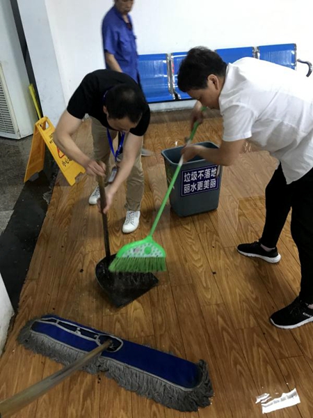 4月24日下午2點(diǎn)后,由于受強(qiáng)對(duì)流云團(tuán)影響,市區(qū)出現(xiàn)了7-9級(jí)大風(fēng),并伴有強(qiáng)雷電和大暴雨。由于這場(chǎng)雨下得又大又急,東站新舊候車廳交界處的下水管出現(xiàn)了倒灌現(xiàn)象,短短幾分鐘時(shí)間,新候車廳5、6號(hào)檢票口附近的地面就積滿了水。值班站長(zhǎng)金翔見狀趕緊叫來工作人員和清潔工,不顧地面的積水和正在往下漏的雨水,合力進(jìn)行積水清理。他們拿起掃把、畚斗、垃圾桶、拖把等工具共同加入戰(zhàn)斗,一邊清理一邊不忘提醒過往的旅客注意腳下,防止滑倒。
