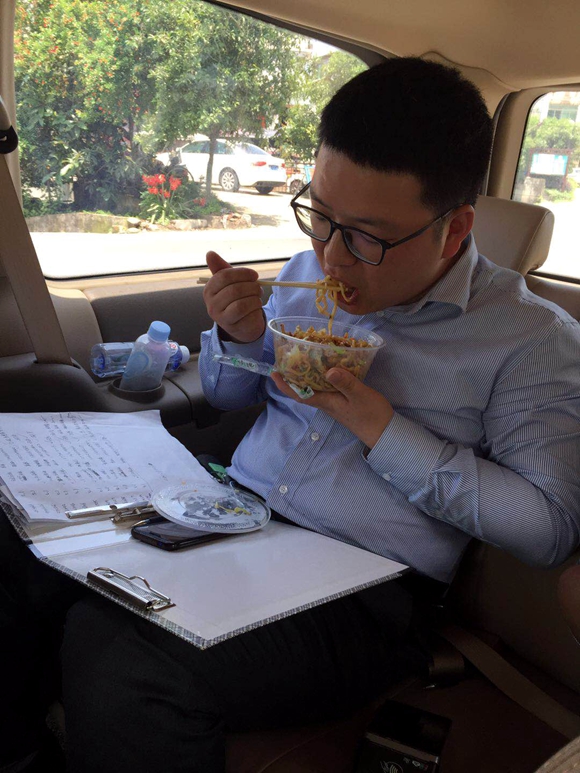 時間在忙而有序中過了飯點,注重細節的他,卻無暇顧及了自己的午飯,還是身邊的同事提醒到吃飯了,他才想起了這個茬。沒見他收拾收拾準備下班,而是一頭鉆進了車后座,端起了一碗早已冷卻的外賣炒面,扒拉了起來,眼睛卻一直離不開懷里的工作簿。同事打趣地說:勇哥,今天上班賺了加班費,還吃的這么省啊?引起一片哄笑……高勇抬起頭笑了笑,“冷面好吃!我得趕緊吃完,客人還等著我送發票呢!”