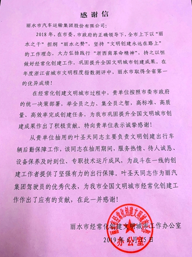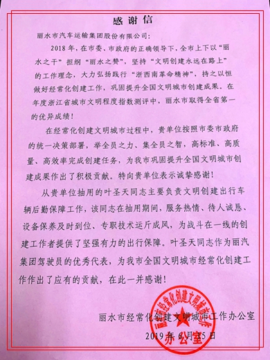 信中還特別表揚了從集團公司抽用的葉圣天同志,在工作中服務熱情、待人誠懇、設備保養及時到位、專職技術運斤成風,為戰斗在一線的創建工作者提供了堅強有力的出行保障。葉圣天同志作為麗汽集團抽用的、主要負責文明創建出行車輛后勤保障工作的優秀駕駛員代表,為我市全國文明城市經常化創建工作作出了應有的貢獻。
