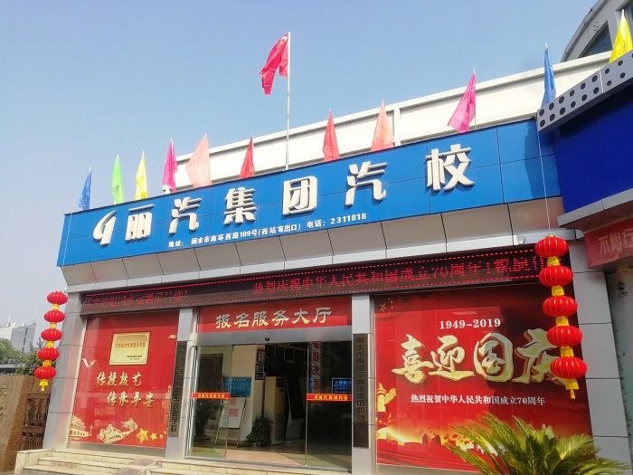 鮮艷的五星紅旗懸掛在汽校報(bào)名注冊(cè)中心大門頂端,四周插著五顏六色的旗幟,在藍(lán)天的映襯下顯得格外耀眼。大門兩側(cè),兩排喜慶的紅燈籠隨風(fēng)搖曳,烘托著祥和的節(jié)日氛圍。LED屏上,“熱烈慶祝中華人民共和國(guó)成立70周年”、“祝愿?jìng)ゴ蟮淖鎳?guó)永遠(yuǎn)繁榮昌盛”的標(biāo)語(yǔ)滾動(dòng)播放,氣氛濃厚。“喜迎國(guó)慶”的巨大金色標(biāo)語(yǔ)和汽校“傳授技藝、傳承平安”核心價(jià)值的巨幅廣告相互輝映,相得益彰。