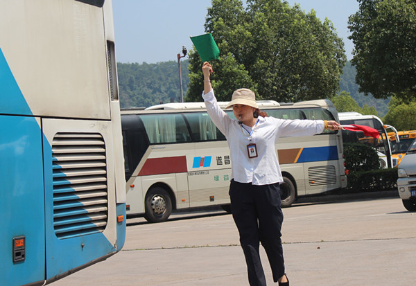 8月3日上午10:30分,地表溫度已經(jīng)接近50攝氏度,走在室外,隔著鞋底就能感受到地面上滾燙的溫度,行車員洪麗頭頂烈日,認(rèn)真地為車輛引航,吹哨、倒走、揮動(dòng)紅綠旗、小跑……一套動(dòng)作下來,豆大的汗水從額頭滴下來。