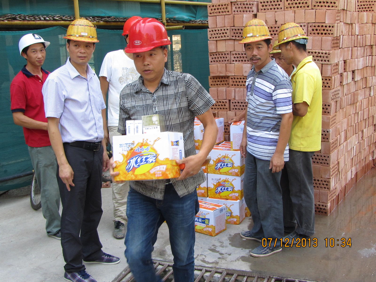 當(dāng)前,夏日炎炎,驕陽(yáng)似火,正值建筑施工生產(chǎn)旺季,金龍.長(zhǎng)運(yùn)花苑工地的工人師傅們頂著高溫酷暑辛勤地工作。2013年7月12日,南明房地產(chǎn)公司工程部在公司副總經(jīng)理的帶領(lǐng)下,帶著清涼食品和防暑保健藥品到施工現(xiàn)場(chǎng)積極開(kāi)展“夏日送清涼”活動(dòng),給奮戰(zhàn)在一線的建筑工人送去項(xiàng)目部的關(guān)懷和慰問(wèn)。并叮囑大家在高溫作業(yè)時(shí),要合理安排作息時(shí)間,做好防暑降溫工作,并要求項(xiàng)目部做好食堂的飲食和疾病防疫等工作,在施工現(xiàn)場(chǎng)按照公司規(guī)定配備安全生產(chǎn)和職業(yè)防護(hù)設(shè)施,加大對(duì)工人的防暑降溫和中暑急救知識(shí)的宣傳教育,確保工人的身體健康和安全施工。